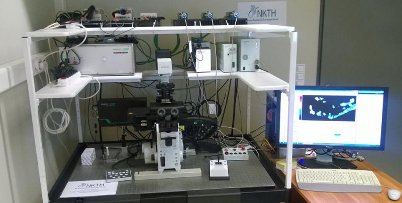 An inverted Olympus IX81 fluorescence microscope is equipped with a Lambert Instruments fluorescence lifetime imaging module, using 4 modulated LEDs in the 405-640 nm range as well as modulated lasers emitting at 445, 488 and 633 nm, and a modulated MCP coupled fast CCD. TIRF illumination is available for all three lasers and prepared for a 4th laser in the green-yellow range. Fluorescence lifetimes of fluorophores can be determined from phase and modulation depth in live or fixed cells and other fluorescent samples. FRET efficiency from fluorescence lifetime can be derived. Using the TIRF mode, measurements can be restricted to the cell membrane or molecular monolayers. Autofocus and real time focus stabilization as well as repositioning in 3D with motorized stage is available. Installed with support from the Baross Gábor Programme REG-EA-09-1-2009-0010.