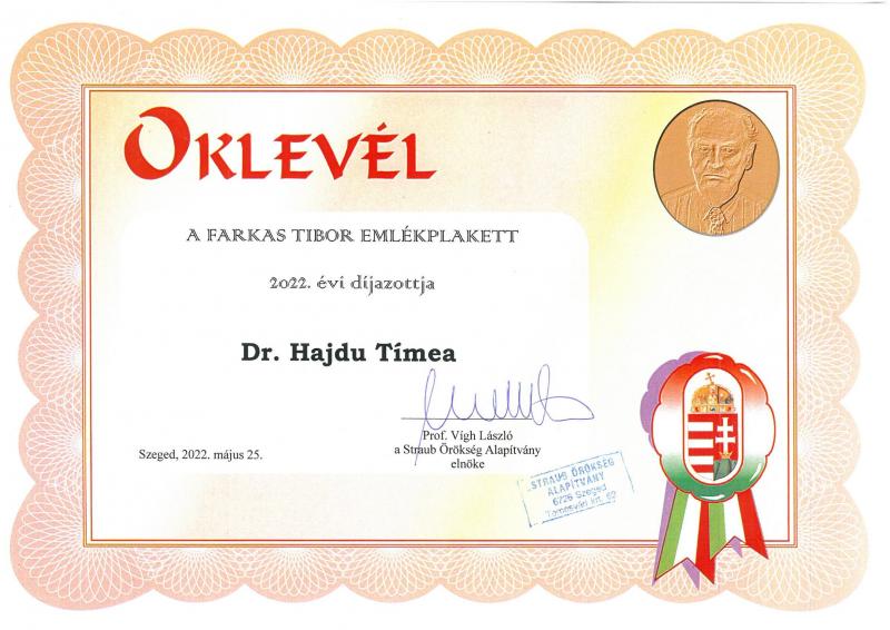 Gratulálunk a "Farkas Tibor emlékplakett 2022" elismerés elnyeréséhez Dr. Hajdu Tímea, tudományos munkatárs kollégánknak.