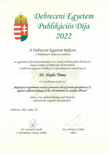 Gratulálunk a "Debreceni Egyetem Publikációs Díja 2022" elismerés elnyeréséhez Dr. Hajdu Tímea, tudományos munkatárs és Dr. Nagy Péter Viktor tanszékvezető egyetemi tanár kollégáinknak, továbbá szerzőtársaiknak.