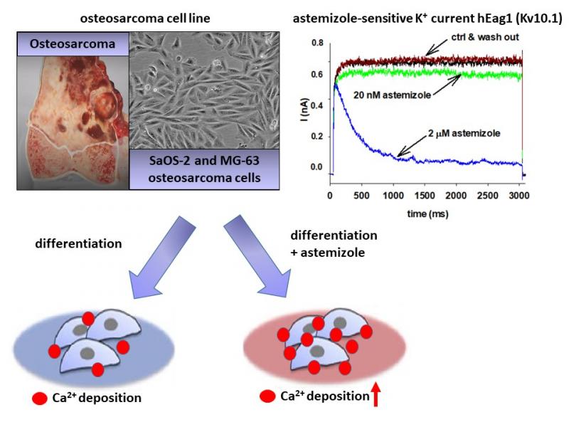 A csontdaganat a 6. leggyakoribb daganatos megbetegedés gyerekeknél és felnőttéknél egyaránt, így az új terápiás lehetőségek kidolgozása rendkívül fontos a kezelésükhöz. A feszültségfüggő hEag1 (Kv10.1) kálium csatorna számos daganat- és tumorsejtben kifejeződik, illetve képes befolyásolni a csontosodást más sejttípusokban. Ennek ismeretében Panyi György Professzor Úr és munkatársai azt feltételezték, hogy a csontdaganat differenciációjában is szerepük lehet, így lehetséges terápiás célpontok a betegség gyógyszeres kezelése során. A hEag1 expresszióját a SaOS-2 sejtekben molekuláris biológiai (RT-PCR), elektrofiziológiai (patch-clamp) és farmakológiai (astemizole érzékenység, IC50=0.135 M) módszerekkel igazolták. Az astemizole egy „régi típusú” antihisztamin, mely képes gátolni a hEag1 ioncsatornát is. 2µM astemizole alkalmazása a SaOS-2 és MG-63 sejtkultúrákban szignifikánsan növelte a Ca2+ lerakódást (a csontosodásra jellemző minerális mátrix termelést) mind a klasszikus, mind a patológiás csontosodási indukció esetében. hErg1 (Kv11.1) ioncsatorna nagyon érzékeny az astemizole-ra, de sem mRNS, sem pedig fehérje szinten nem mutatták ki a csatorna jelenlétét az MG-63 és SaOS-2 sejtekben, illetve az elektrofiziológiai vizsgálatok sem mutattak hErg1-szerű áramot a SaOS-2 sejtekben. Ezek alapján azt feltételezik, hogy a hEag1 gátlása a már jól ismert antihisztamin, az astemizole alkalmazásával új terápiás lehetőség lehet a csontdaganat kezelésében, a daganat terminális differenciációjának előre mozdításával. Eredményiket az International Journal of Molecular Sciences című folyóiratban tették közzé (DOI: https://doi.org/10.3390/ijms231810533).