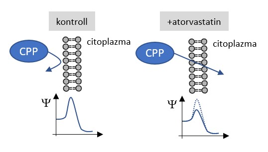 A DE Biofizikai és Sejtbiológiai Intézetének, valamit Genetikai és Alkalmazott Mikrobiológiai Tanszékének, illetve a Semmelweis Egyetem Szerves Vegytani Intézetének együttműködésében végrehajtott kutatás megállapította, hogy a sejtpenetráló peptidek (cell penetrating peptide, CPP) felvétele a sejtmembrán dipólpotenciáljától függ, és a dipólpotenciál csökkentésével a folyamat fokozható. A sejtpenetráló peptidek olyan molekulák, melyek az intakt sejtmembránon képesek különböző, a membránon nehezen áthatoló gyógyszermolekulákat a sejtekbe juttatni. Nagy Péter munkacsoportja kimutatta, hogy a felvétel elsősorban endocitózissal, majd innen történő kijutással („endosomal escape”) történik. Mivel a sejtpenetráló peptidek általában pozitív töltésűek, a sejtmembránban rendezetten elhelyezkedő dipólok miatt kialakuló, a membrán belsejében pozitív dipólpotenciál a membránon való áthaladásukat gátolja. A magas koleszterinszint kezelésében széleskörűen alkalmazott atorvastatinnal a dipólpotenciál csökkenthető, és jelentősen fokozható a sejtpenetráló peptidek felvétele. A kísérleti eredmények, melyek a British Journal of Pharmacology folyóiratban jelentek meg (https://doi.org/10.1111/bph.15509), elvi lehetőséget teremtenek arra, hogy a felfedezett mechanizmust emberi betegségek kezelésére is fel lehessen használni.