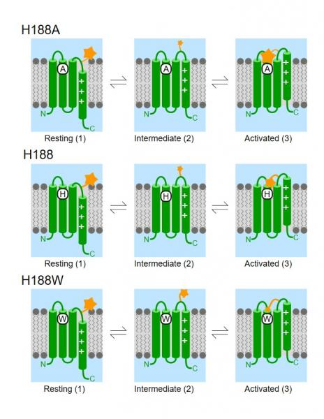 A „Voltage-clamp fluorometry” (VCF) technika információt szolgáltat a feszültség-kapuzott fehérjék konformációs változásairól. A jelet egy fluoreszcens festék (TAMRA) fluoreszcencia-intenzitásának változása adja, amely a vizsgált fehérjének azon részéhez kötődött, amely a membránpotenciál elektródok általi megváltoztatásakor konformációs átrendeződésen megy keresztül. A VCF jel a fluoreszcencia csökkenése és növekedése révén jön létre, ahogy a festék áthalad különböző lokális környezeteken. Mi a VCF jel keletkezését úgy vizsgáltuk, hogy a Hv1 feszültség-kapuzott protoncsatornát mint eszköz haszáltuk, ami hasonló feszültség-érzékelő résszel rendelkezik, mint a többi feszültség-kapuzott ioncsatorna, de nincs ionvezető pórusa. Mutagenezissel és az extracelluláris oldathoz adott lipid-molekulák segítségével megállapítottuk, hogy a jelet összetett hatás hozza létre: a lipidek (fluoreszcenciát növelő) hatása a festéknek a sejtmembrán síkjához viszonyított mozgása során, valamint bizonyos aminosavak fluoreszcenciát kioltása hatása. A 3-állapotú modellünk összefoglalja a különböző mutánsok VCF jeleinek keletkezését, ami összeegyeztethető a két fő feszültség-függő konformációs mozgás elfogadott modelljével.