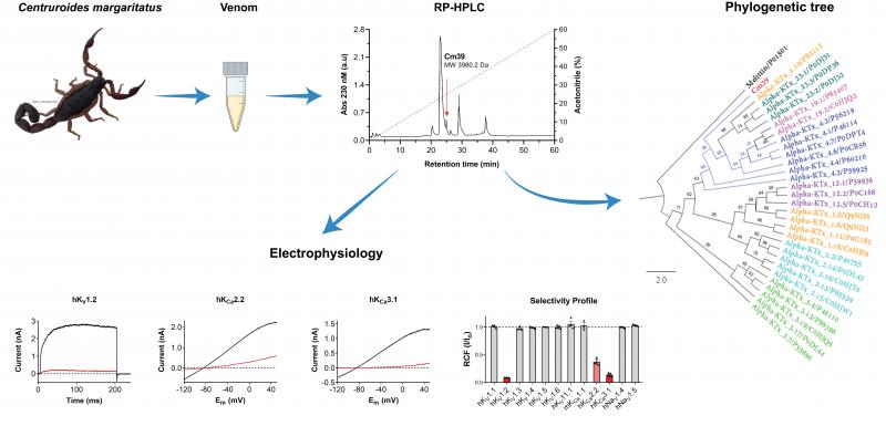 Muhammad Umair Naseem, Panyi György és munkatársai nemzetközi együttműködésben Possani professzor kutatócsoportjával (UNAM, Mexikó) olyan peptid toxinokon dolgoznak, amelyek különböző káliumcsatornákat gátolnak, és terápiás potenciállal rendelkeznek. Legfrissebb közleményükben a Cm39-ként elnevezett skorpiótoxint vizsgáltak, amelyet a Centruroides margaritatus mérgéből izoláltak. Ez egy 37 aminosav hosszú peptid, amely nagy hasonlóságot mutat a már ismert K+ csatorna gátló skorpiótoxinnal (KTx), a filogenetikai elemzés szerint a Cm39 az α-KTx 4 családba tartozik. A Cm39 szokatlan szelektivitási profilt mutatott, a feszültség-kapuzott Kv1.2 K+ csatorna és a Ca2+-aktivált KCa2.2 és KCa3.1 csatornák érzékenyek erre a toxinra. A Cm39 affinitása a Kv1.2 és KCa3.1 csatornákra alacsony nanomoláris tartományban van, azonban a KCa2.2 csatornához való affinitása szerényebb. A Kv1.2 vezetőképesség-feszültség összefüggése és a toxin kötődési kinetikájának elemzése alapján a Cm39 a pórusblokkoló mechanizmust követi. A szelektivitási vizsgálat alapján a Cm39 nem gátol számos más kálium- és nátriumcsatornát magas, 1 µM koncentrációban. A Cm39 potenciális gyógyszerjelöltként szolgálhat, amely egyszerre képes megcélozni a KCa2.2 és a KCa3.1 csatornákat, és ezáltal segíthet a pitvarfibrilláció csökkentésében. A vizsgálat eredményeit az MDPI Toxins című folyóiratában tették közzé. (DOI: https://doi.org/10.3390/toxins15010041)